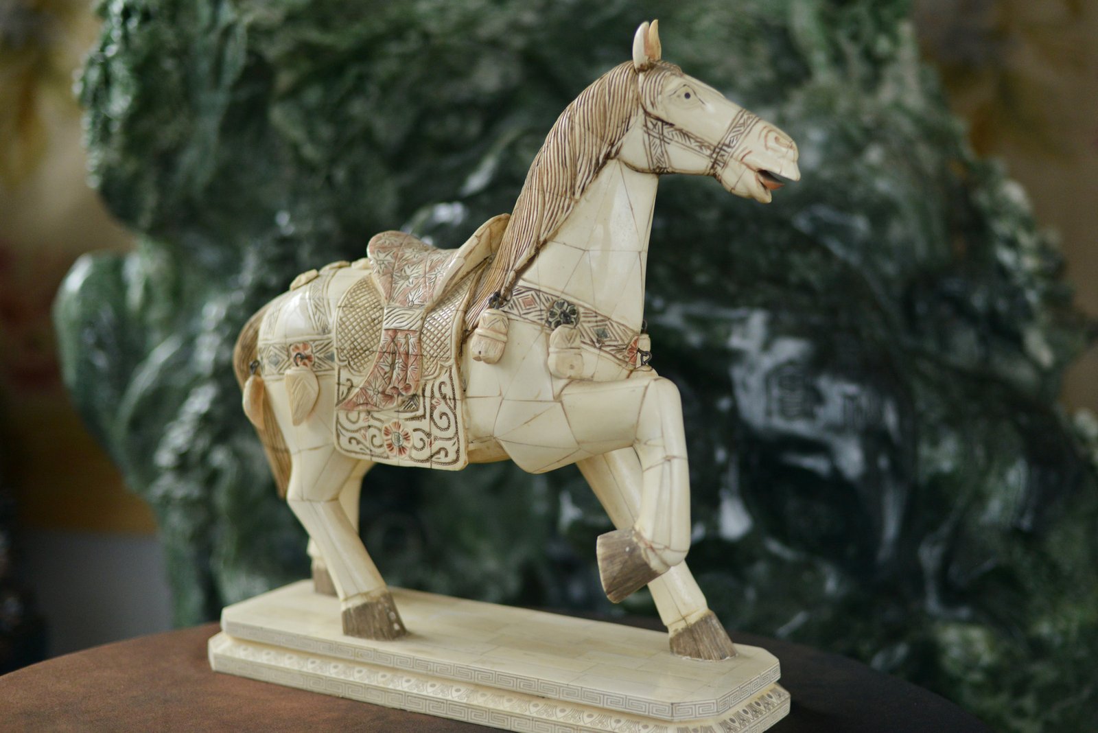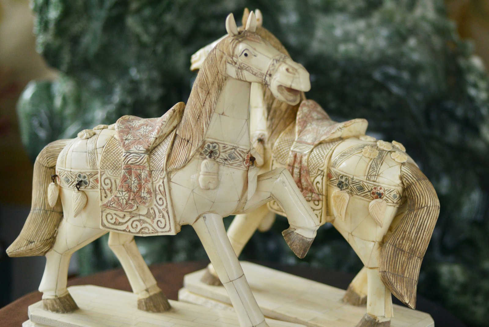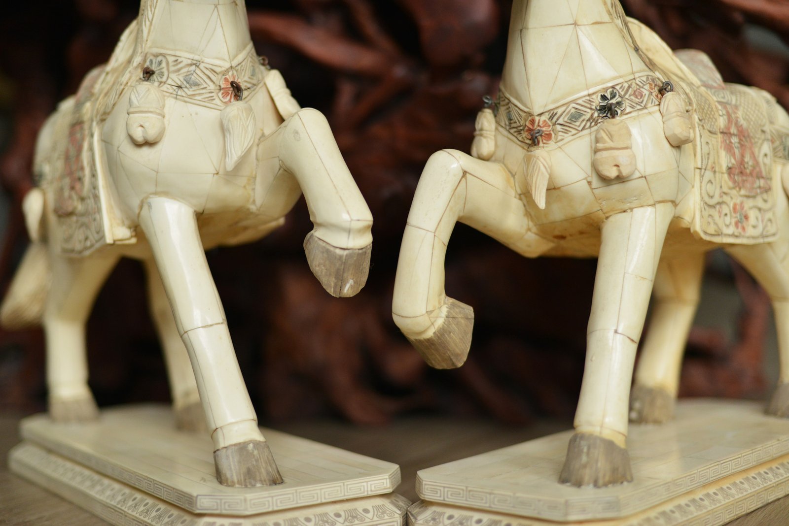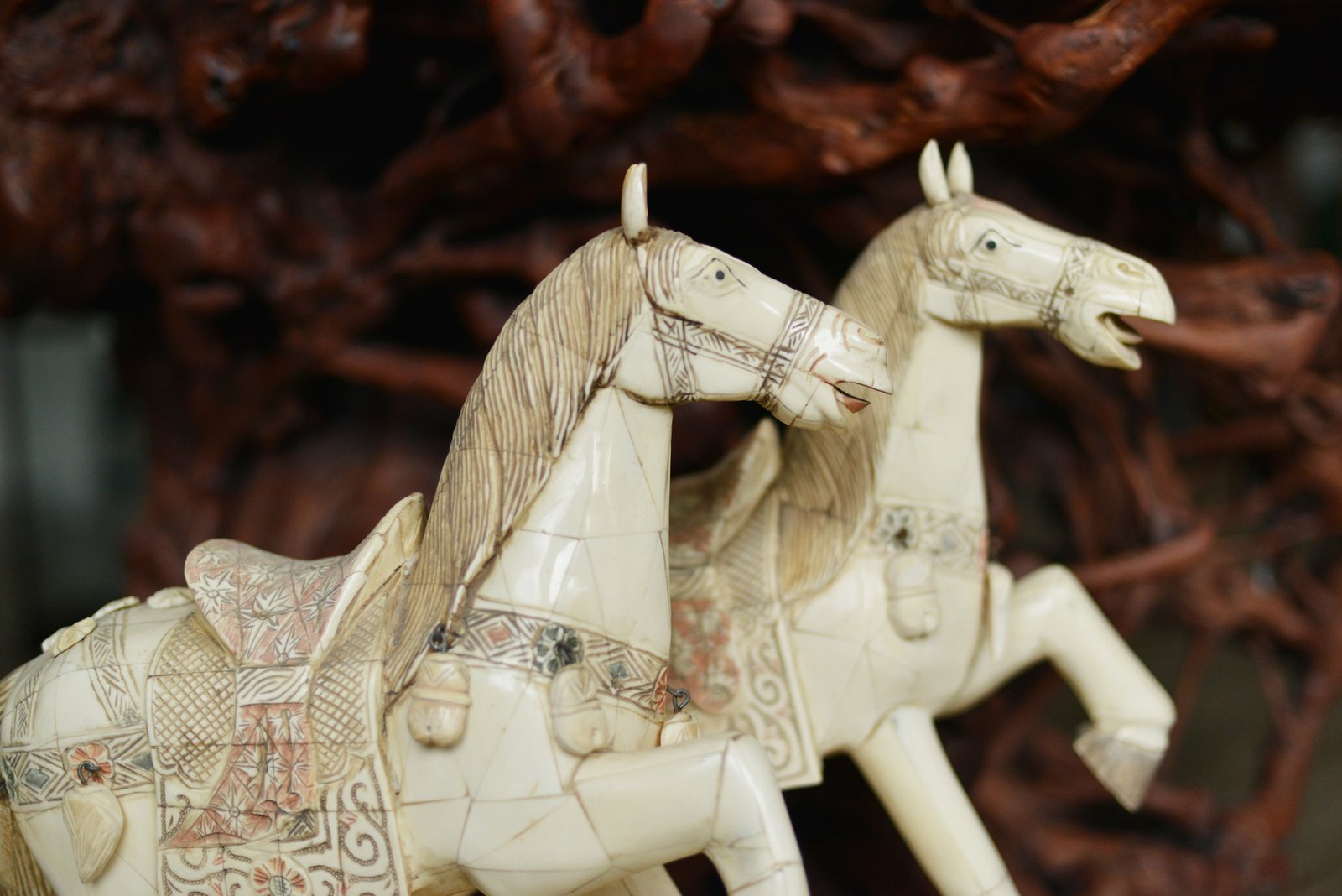 saisis dans un mouvement suspendu, semblent avancer d’un pas alerte, conférant à l’ensemble une présence dynamique et solennelle à la fois. Chaque cheval est richement caparaçonné : tapis de selle ornés de motifs géométriques et floraux, harnais finement détaillés agrémentés de petits pendentifs, travail délicat de la crinière et de la queue. L’attention portée aux détails révèle un remarquable savoir-faire, où la précision du geste sert l’élégance de la forme. La composition séduit par la minutie de son exécution : assemblage en facettes, gravures fines et jeux de contrastes subtils entre les tonalités ivoire et les décors polychromes. Les socles, élégamment bordés, accentuent le caractère muséal de ces pièces et renforcent leur statut d’objets de collection. Évocation de puissance, de mouvement et de prospérité, ce duo constitue également un clin d’œil symbolique à l’année du Cheval, célébrée à partir du 17 février 2026.