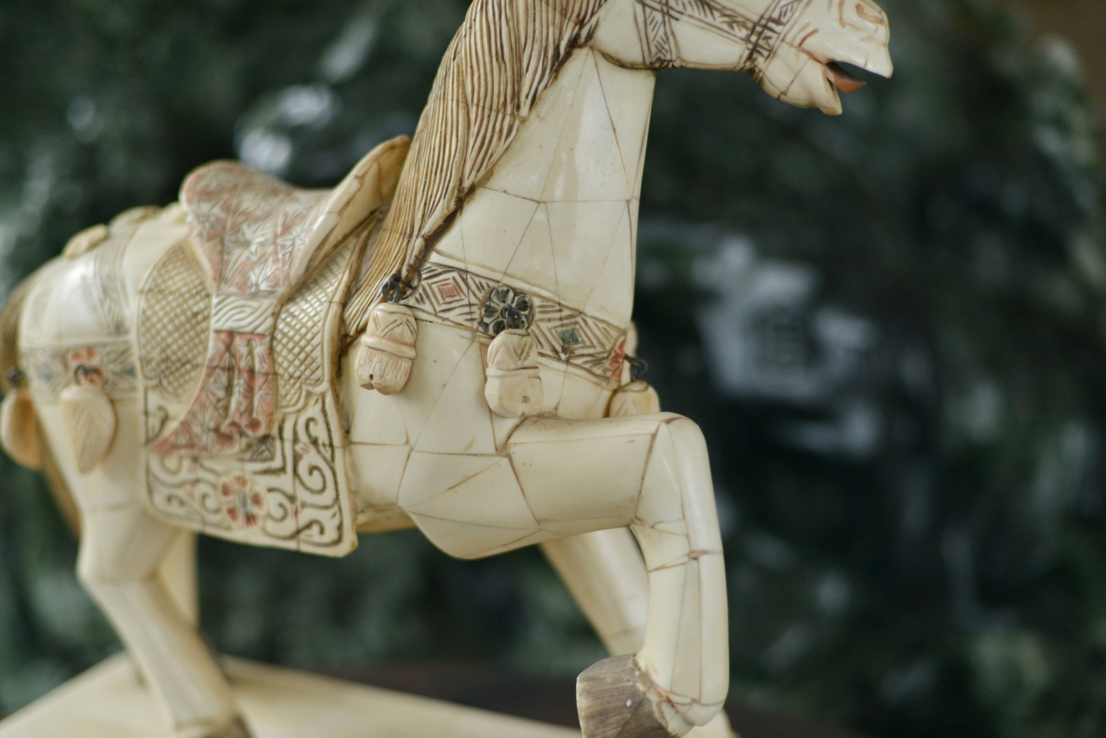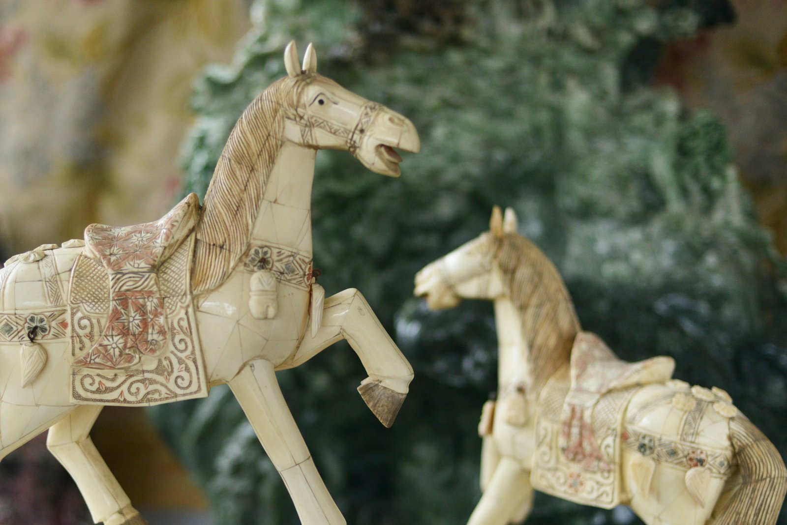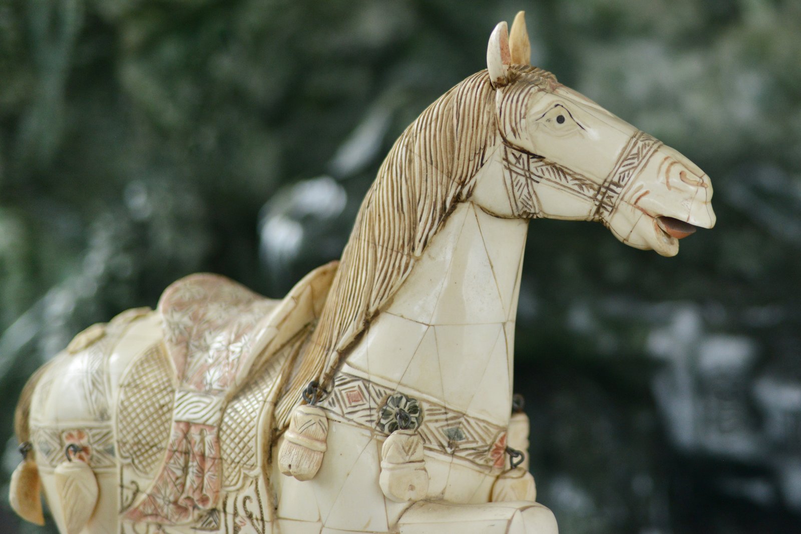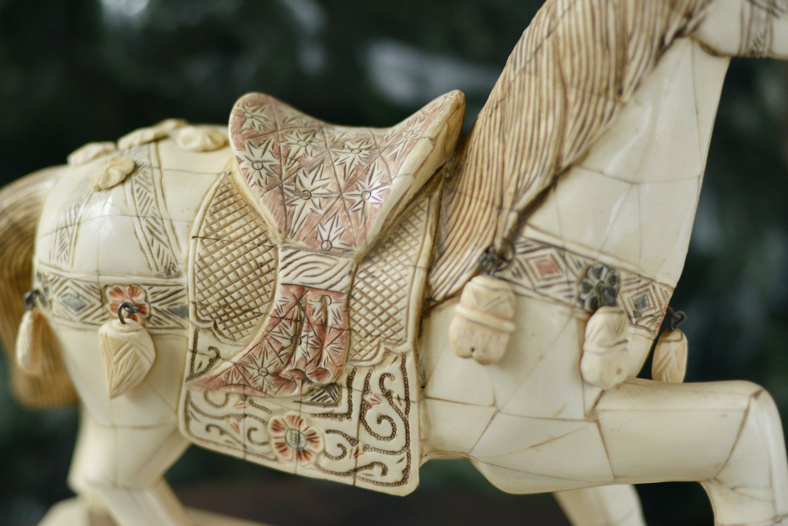 saisis dans un mouvement suspendu, semblent avancer d’un pas alerte, conférant à l’ensemble une présence dynamique et solennelle à la fois. Chaque cheval est richement caparaçonné : tapis de selle ornés de motifs géométriques et floraux, harnais finement détaillés agrémentés de petits pendentifs, travail délicat de la crinière et de la queue. L’attention portée aux détails révèle un remarquable savoir-faire, où la précision du geste sert l’élégance de la forme. La composition séduit par la minutie de son exécution : assemblage en facettes, gravures fines et jeux de contrastes subtils entre les tonalités ivoire et les décors polychromes. Les socles, élégamment bordés, accentuent le caractère muséal de ces pièces et renforcent leur statut d’objets de collection. Évocation de puissance, de mouvement et de prospérité, ce duo constitue également un clin d’œil symbolique à l’année du Cheval, célébrée à partir du 17 février 2026.