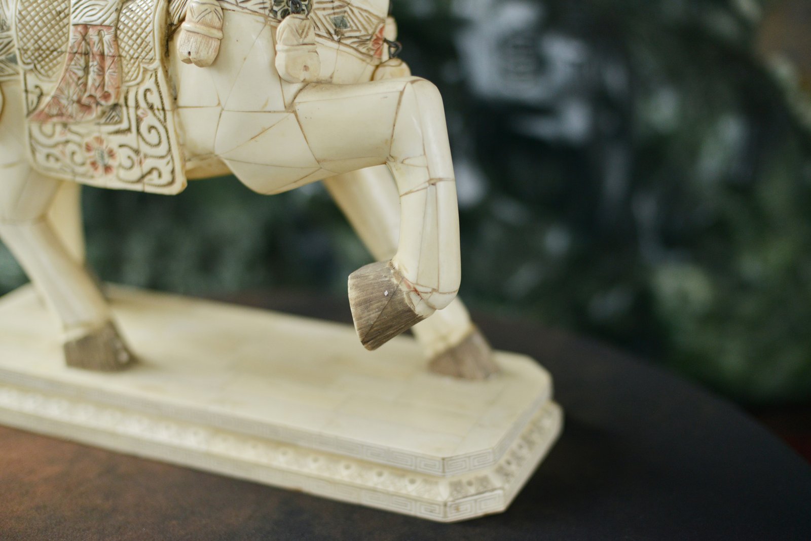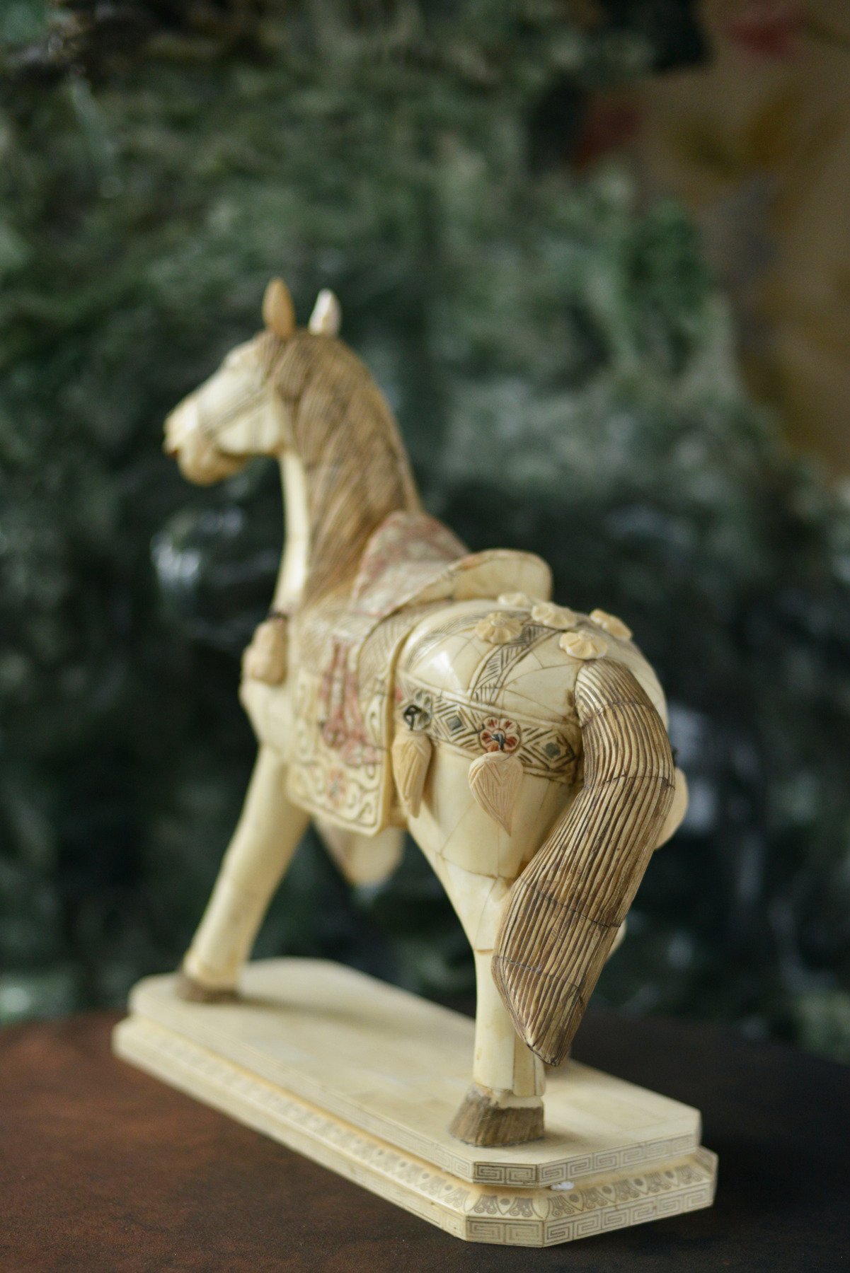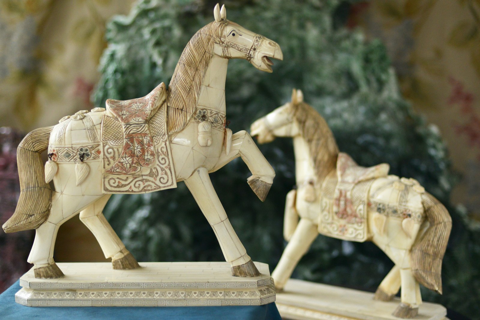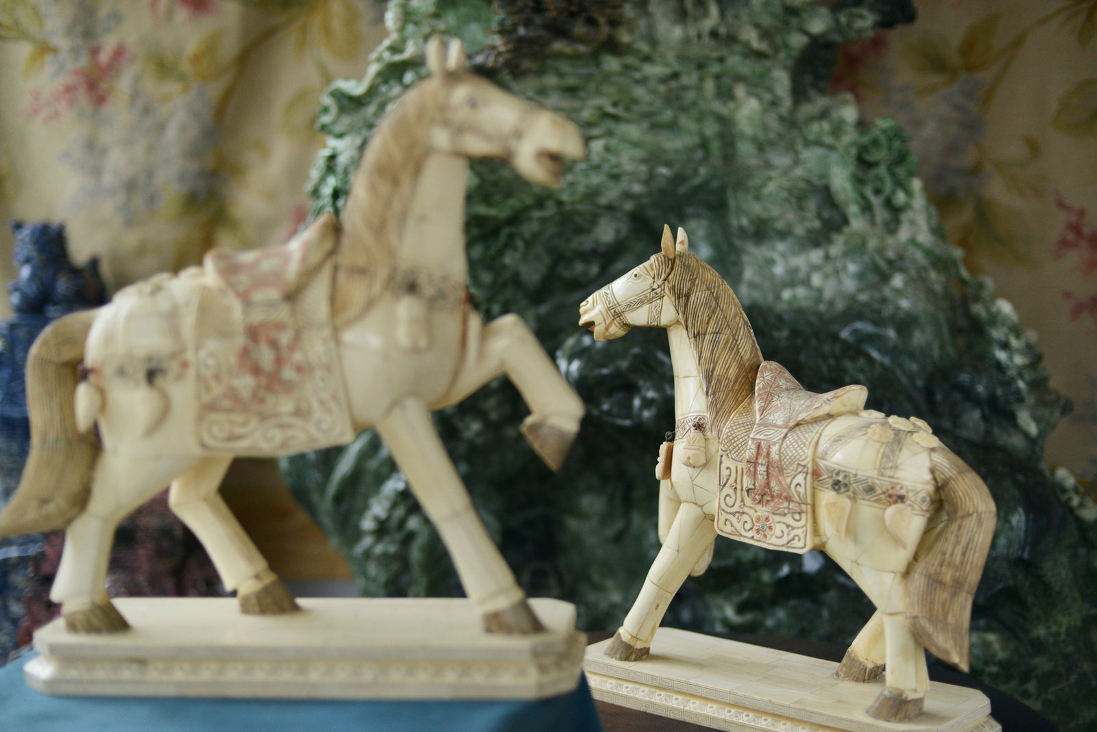 saisis dans un mouvement suspendu, semblent avancer d’un pas alerte, conférant à l’ensemble une présence dynamique et solennelle à la fois. Chaque cheval est richement caparaçonné : tapis de selle ornés de motifs géométriques et floraux, harnais finement détaillés agrémentés de petits pendentifs, travail délicat de la crinière et de la queue. L’attention portée aux détails révèle un remarquable savoir-faire, où la précision du geste sert l’élégance de la forme. La composition séduit par la minutie de son exécution : assemblage en facettes, gravures fines et jeux de contrastes subtils entre les tonalités ivoire et les décors polychromes. Les socles, élégamment bordés, accentuent le caractère muséal de ces pièces et renforcent leur statut d’objets de collection. Évocation de puissance, de mouvement et de prospérité, ce duo constitue également un clin d’œil symbolique à l’année du Cheval, célébrée à partir du 17 février 2026.