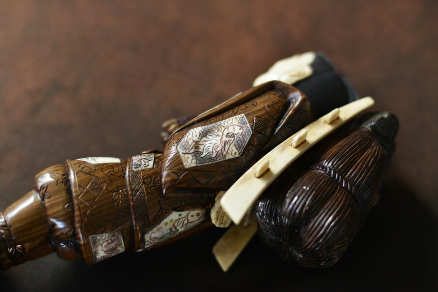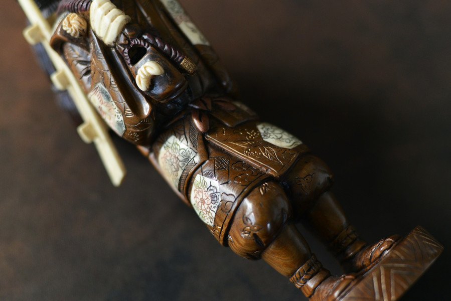 Le kimono est finement gravé de motifs traditionnels japonais — oiseaux, fleurs et ornements géométriques. Certaines parties sont incrustées d’éléments plus clairs, créant un jeu raffiné de textures et de nuances. À l’arrière, le chargement est minutieusement travaillé et fixé sur une structure évoquant un cadre en bois.