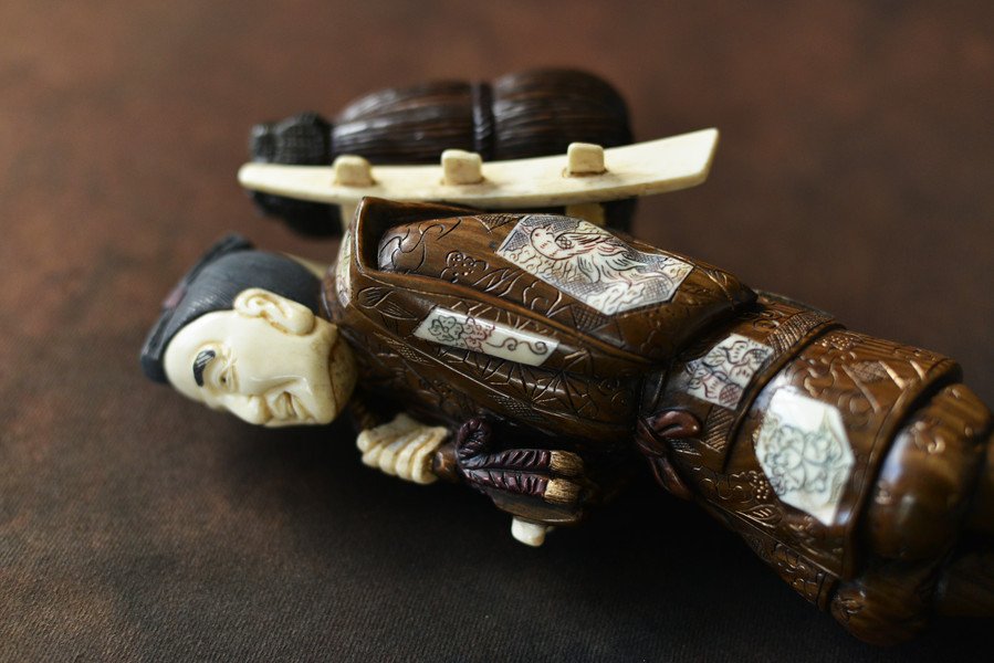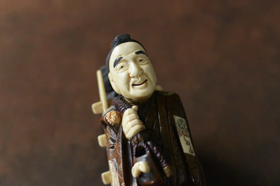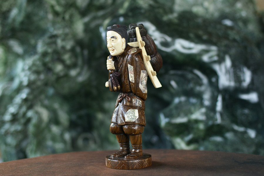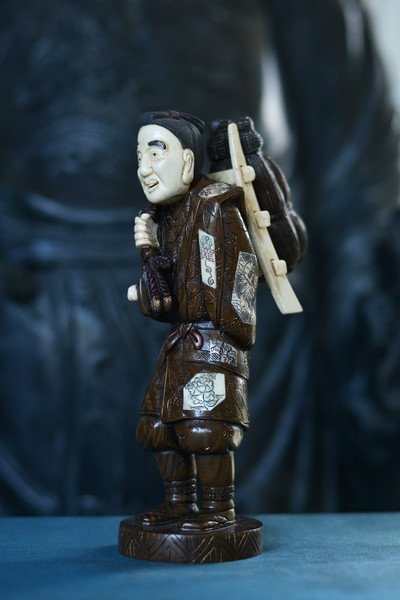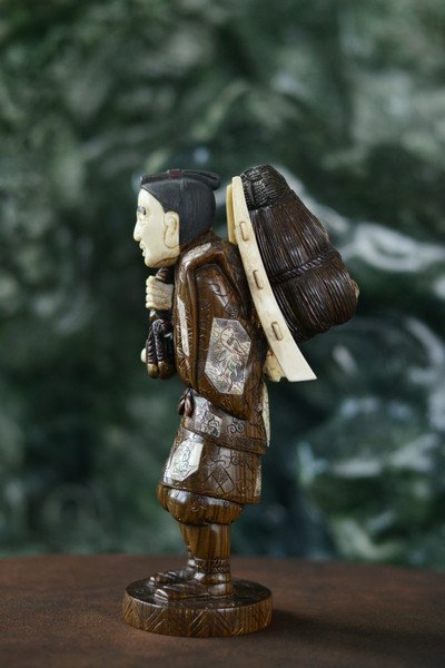Sculpture japonaise sculptée de type okimono représentant un marchand ambulant ou un voyageur portant un grand ballot sur le dos. La figure est réalisée avec un grand souci du détail : le visage expressif en matériau clair contraste harmonieusement avec la teinte chaude et sombre du corps.