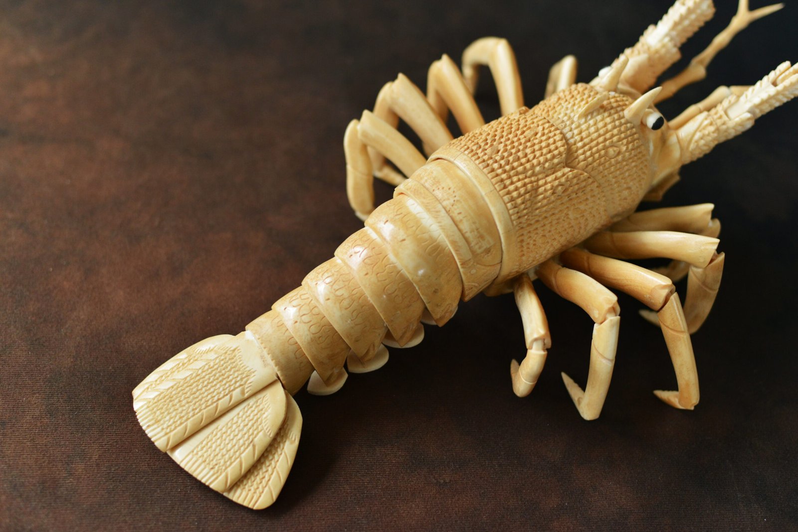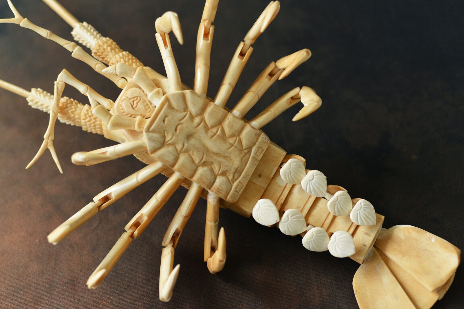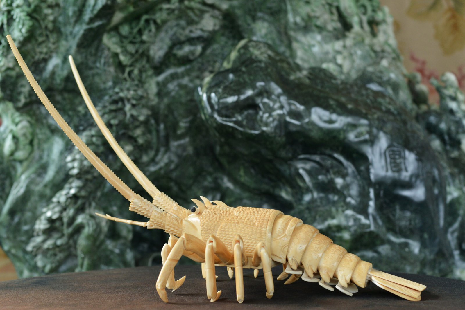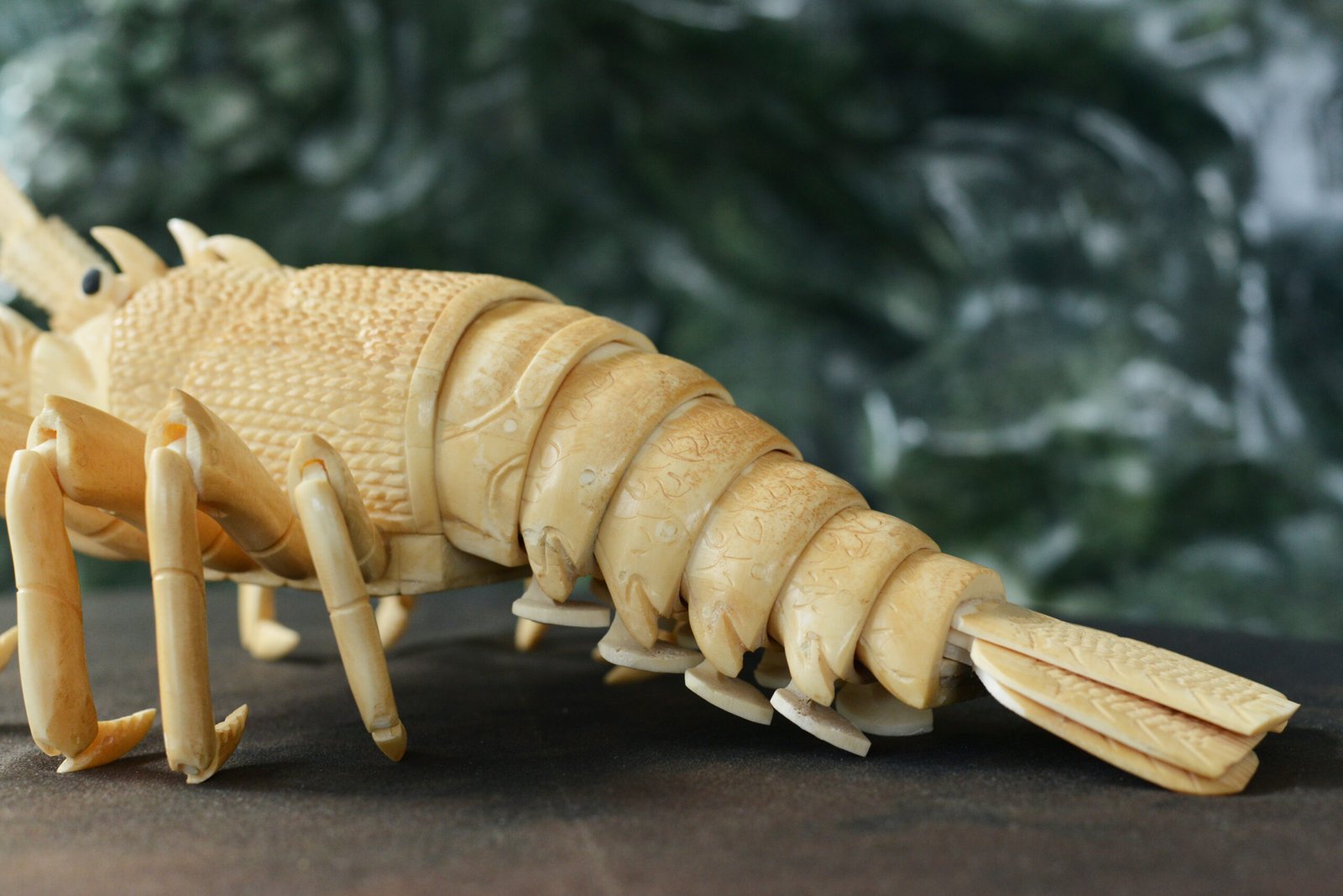 Véritable prouesse technique et artistique, cette langouste articulée est entièrement mobile : pattes, corps et longues antennes sont assemblés avec une précision remarquable, lui donnant une présence étonnamment vivante.