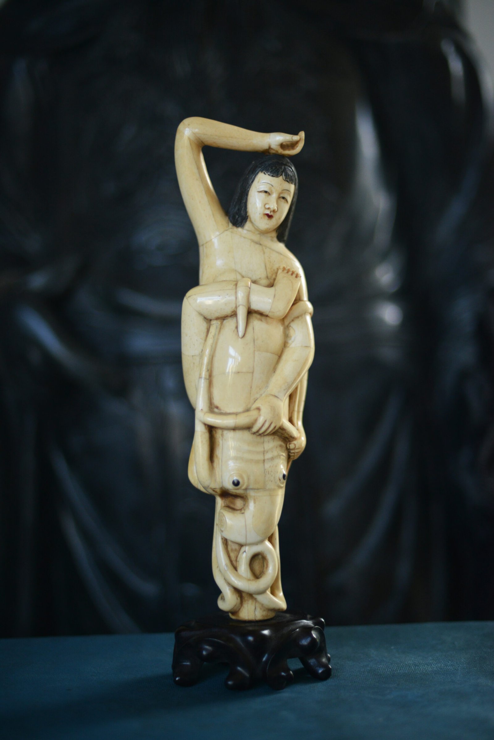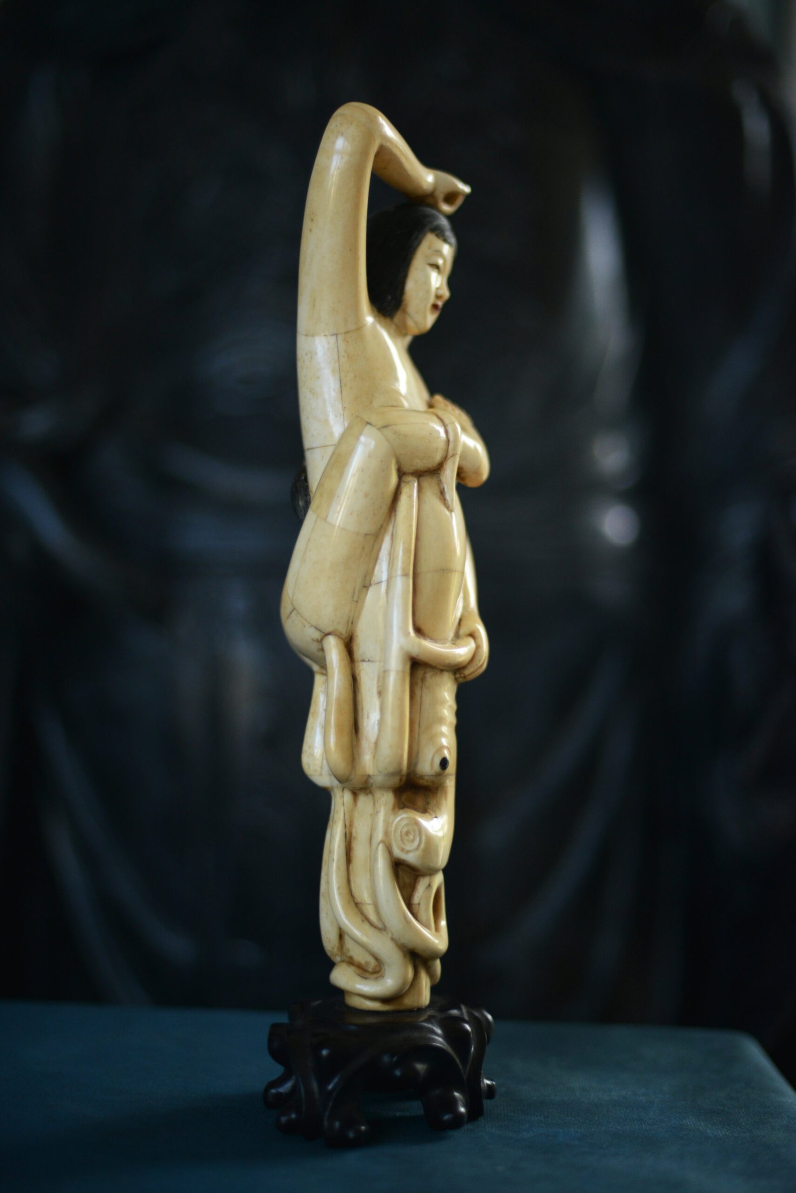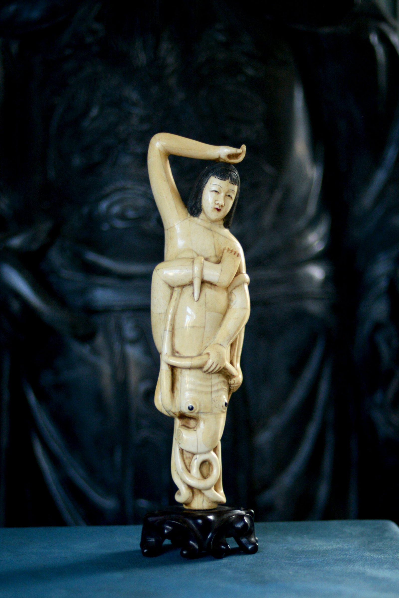 Étonnante scène sculptée en marqueterie d’os, représentant une jeune femme enlacée par une pieuvre aux tentacules enroulés. La composition, à la fois narrative et décorative, joue sur le contraste entre la douceur du visage, les lignes du corps et le mouvement sinueux des tentacules, finement travaillés.