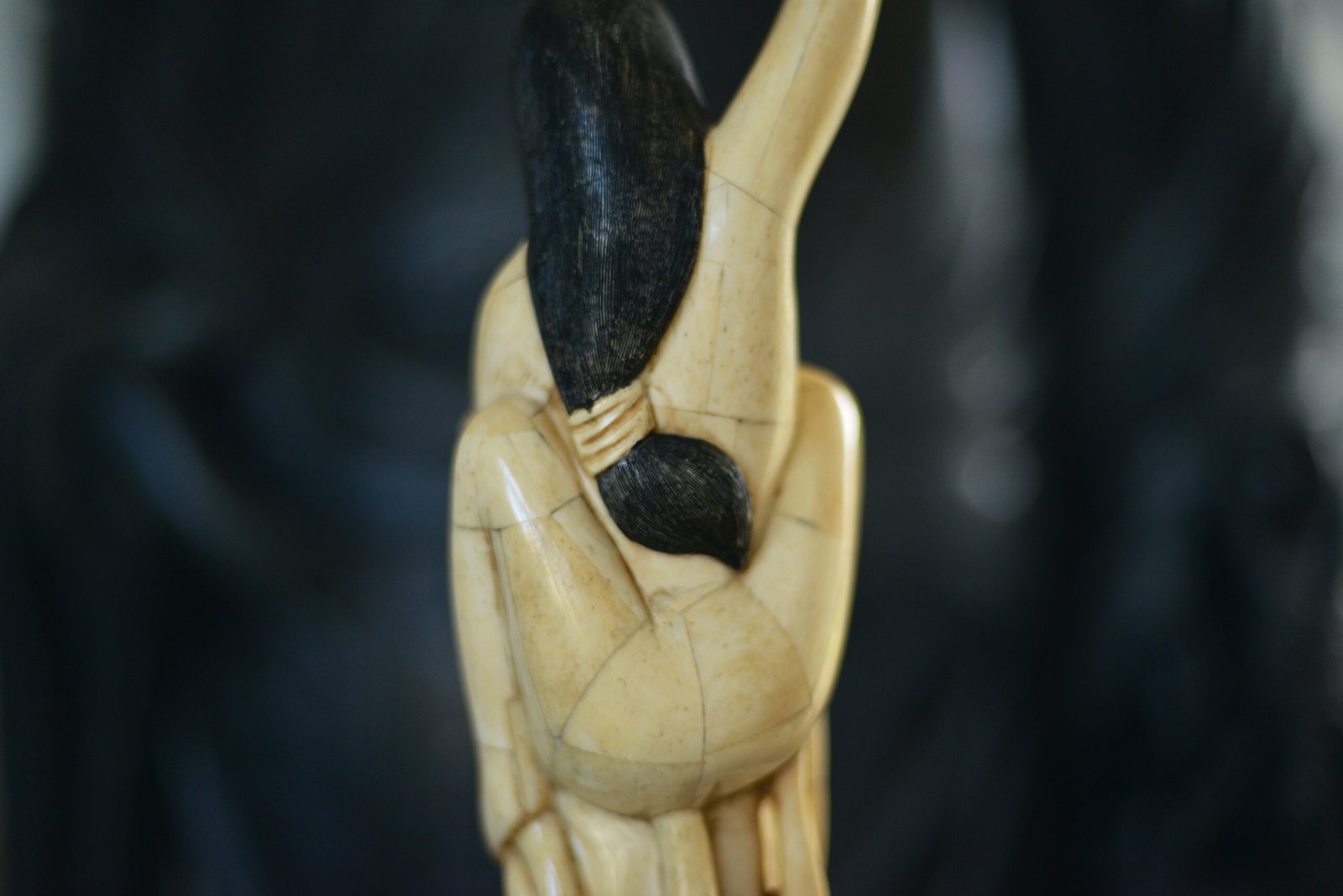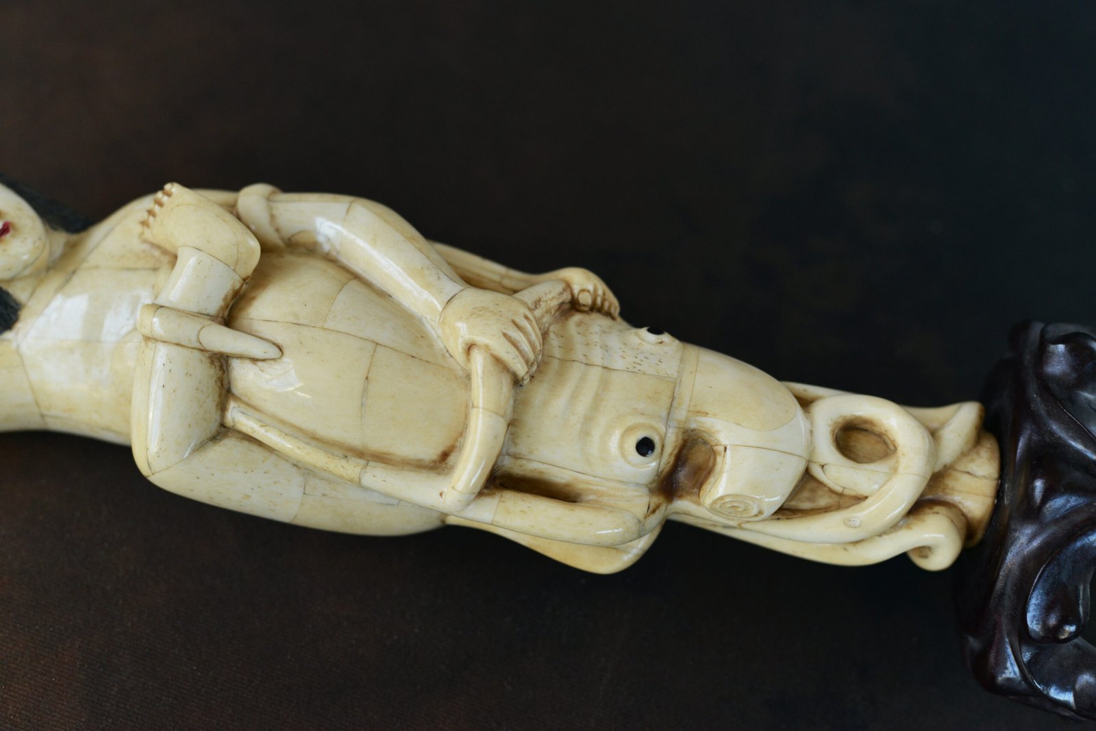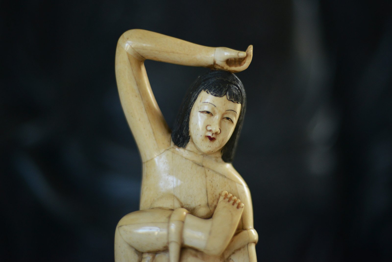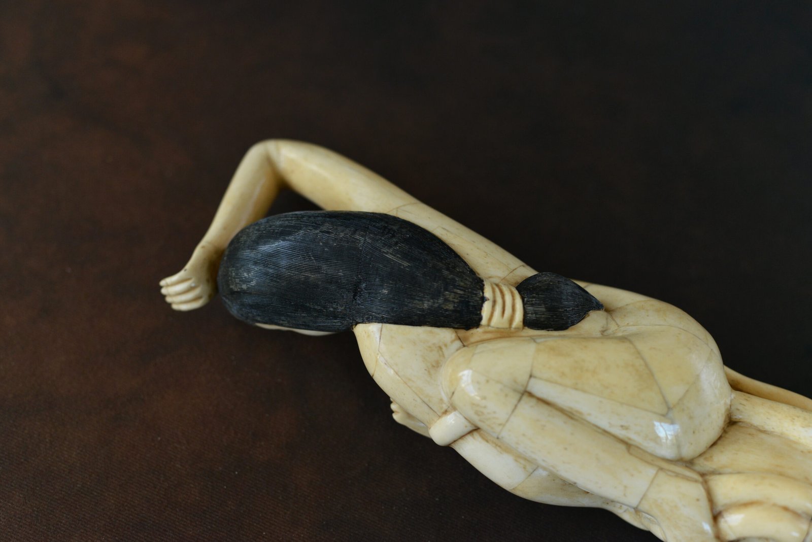 Étonnante scène sculptée en marqueterie d’os, représentant une jeune femme enlacée par une pieuvre aux tentacules enroulés. La composition, à la fois narrative et décorative, joue sur le contraste entre la douceur du visage, les lignes du corps et le mouvement sinueux des tentacules, finement travaillés.