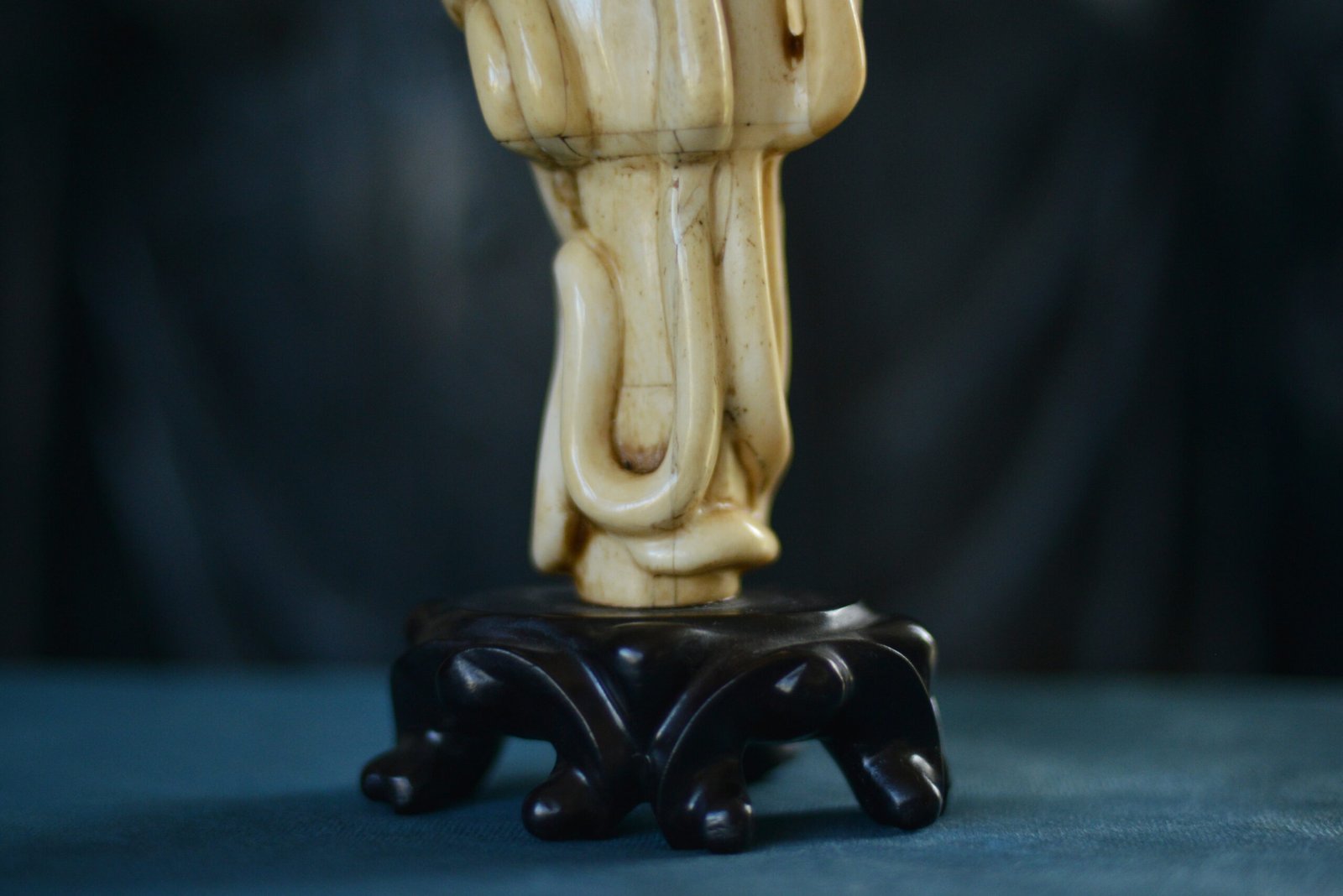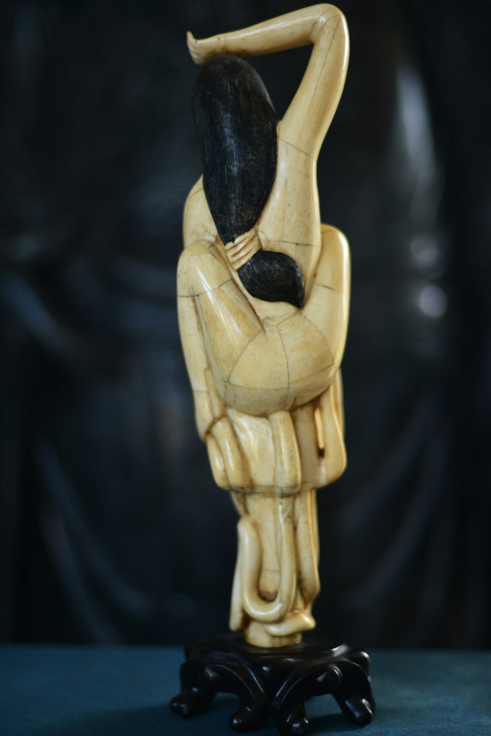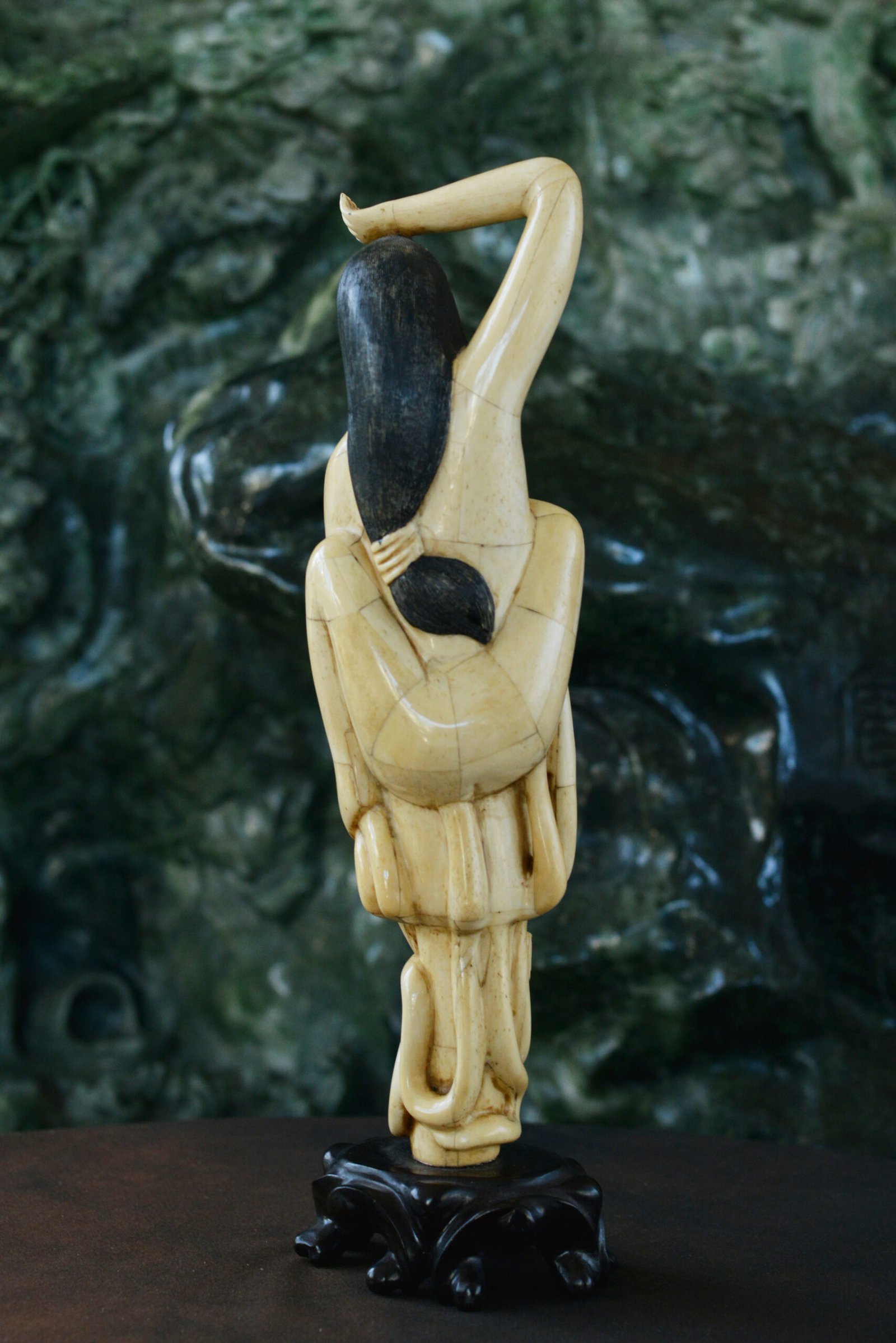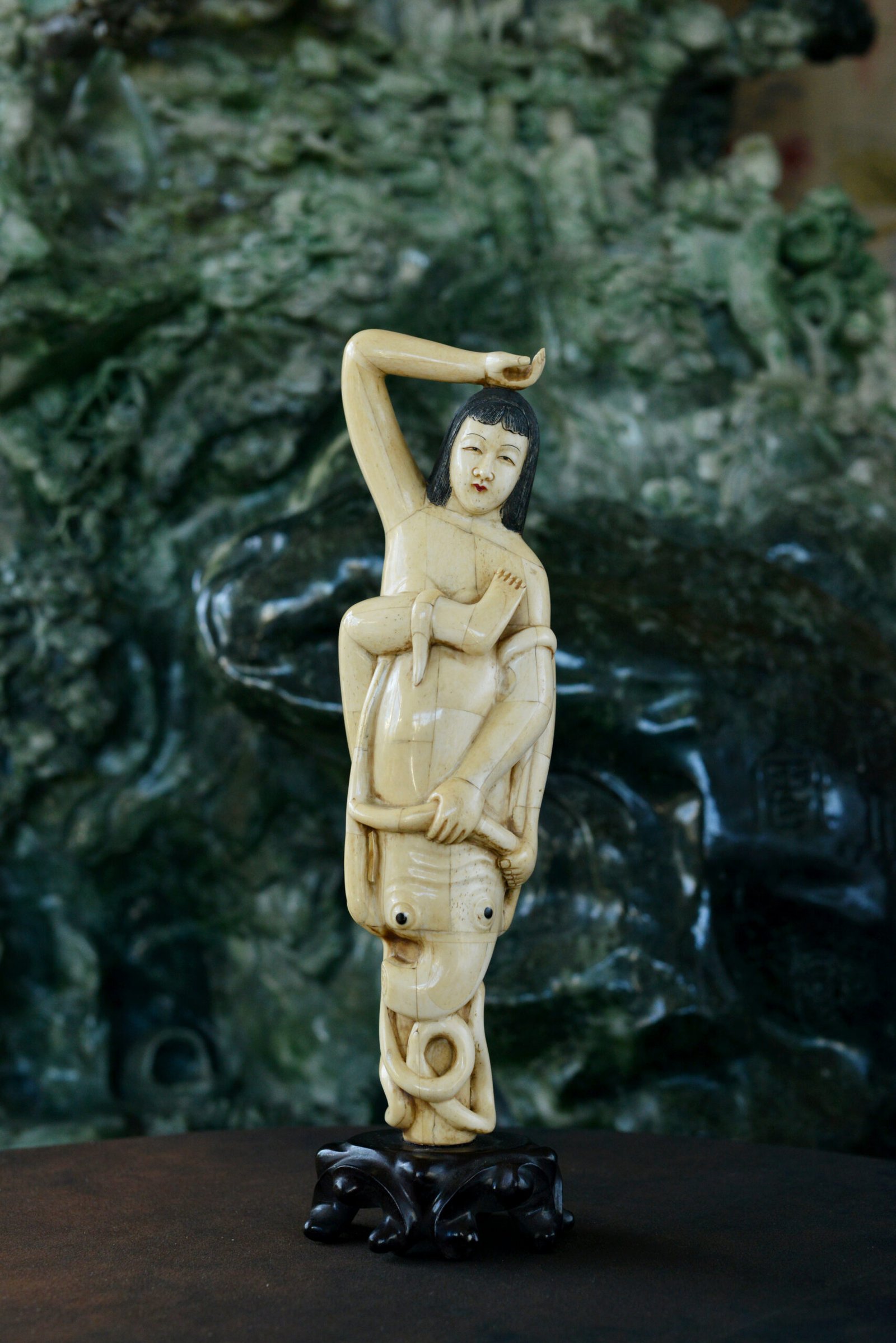 Set on a black base, which enhances the warm tone of the bone and the precision of the carving. A captivating piece, somewhere between a cabinet-of-curiosities object and an artwork, perfect for a display case and for lovers of unusual marine scenes.