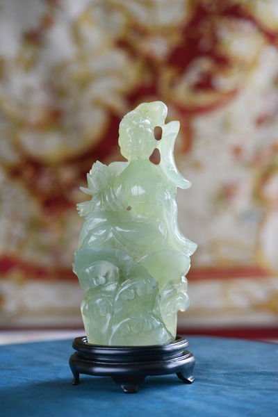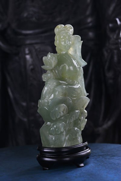 Elegant green serpentine sculpture depicting a spiritual female figure, seated and holding a lotus flower. The stone, slightly translucent, catches the light beautifully and reveals subtle gradations ranging from pale, watery green to a deeper shade.