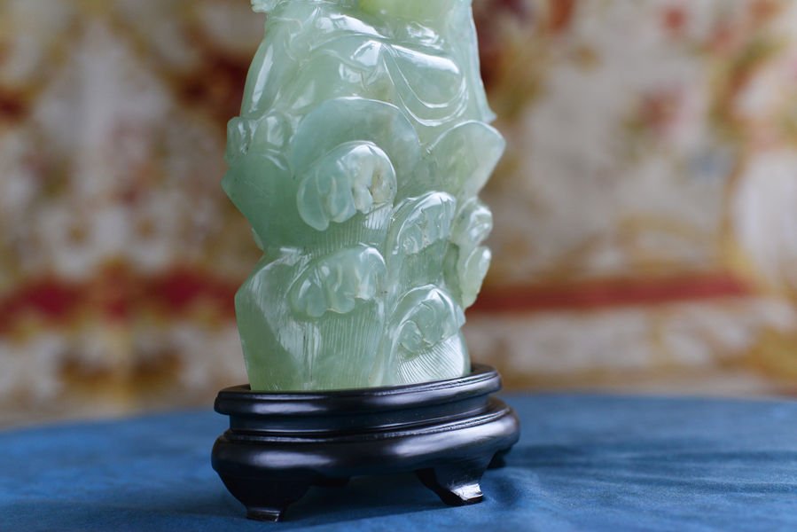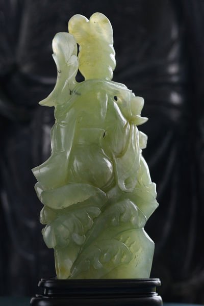 Élégante sculpture en serpentine verte représentant une figure féminine spirituelle, assise, tenant une fleur de lotus. La pierre, légèrement translucide, capte merveilleusement la lumière et révèle de subtils dégradés allant du vert d’eau au vert plus soutenu.