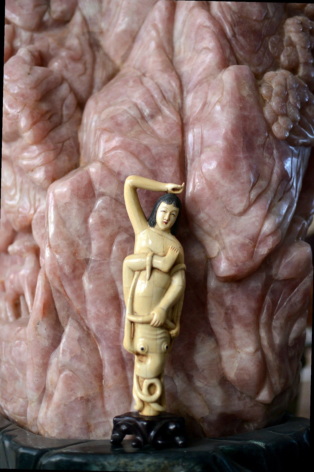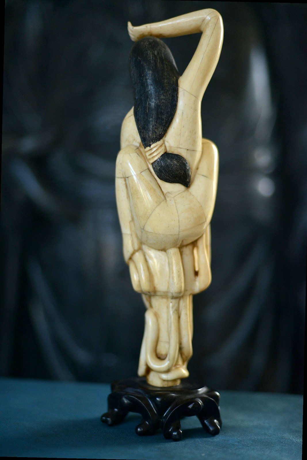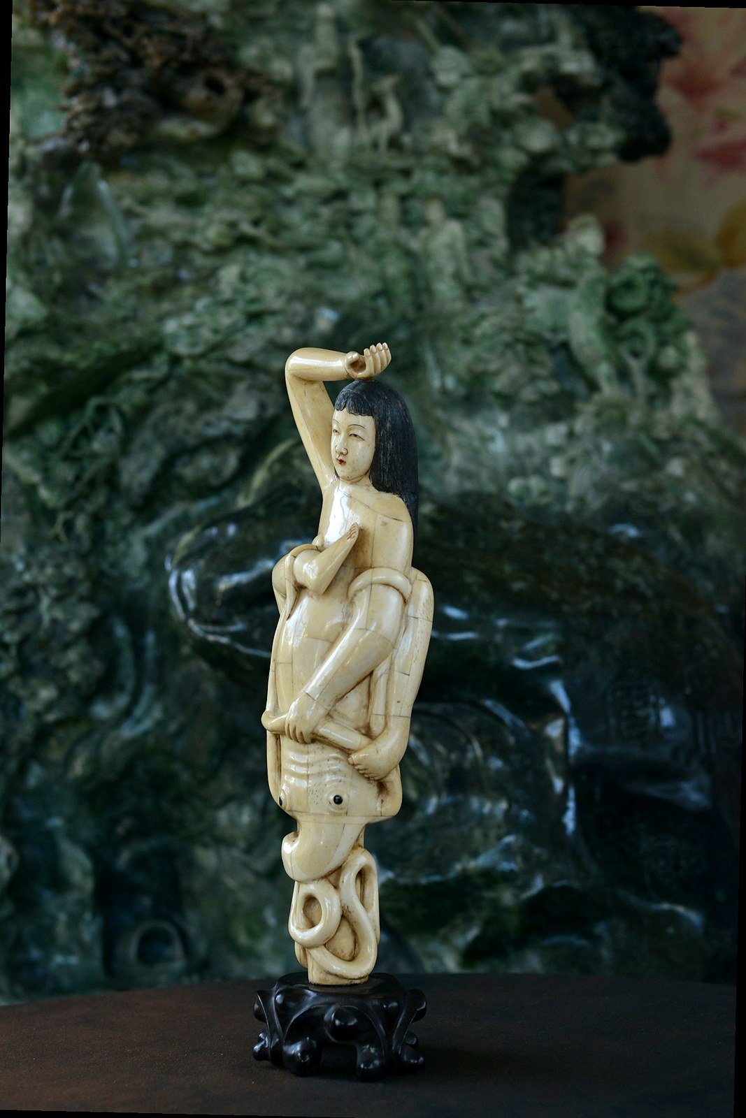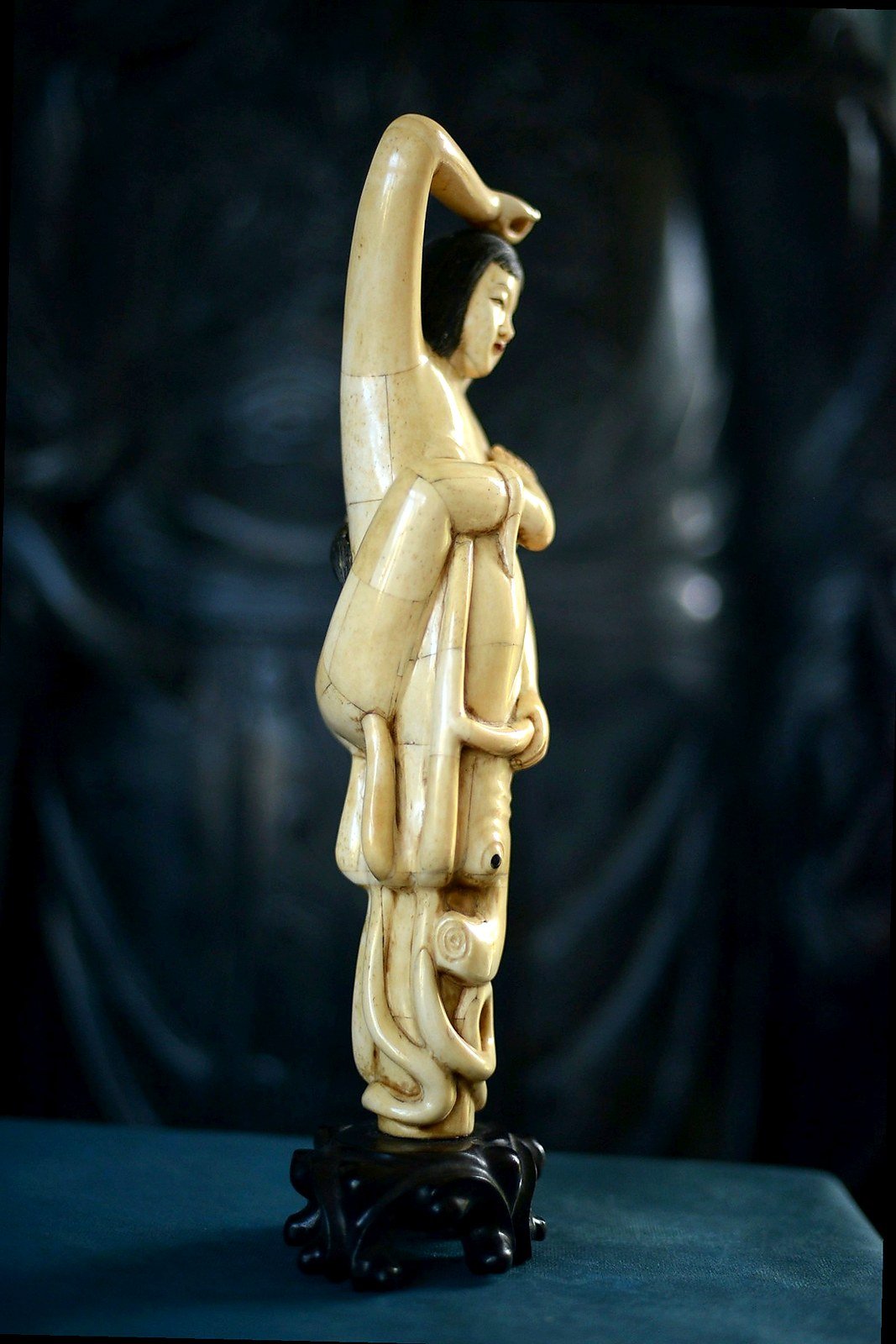 Étonnante scène sculptée en marqueterie d’os, représentant une jeune femme enlacée par une pieuvre aux tentacules enroulés. La composition, à la fois narrative et décorative, joue sur le contraste entre la douceur du visage, les lignes du corps et le mouvement sinueux des tentacules, finement travaillés.