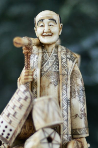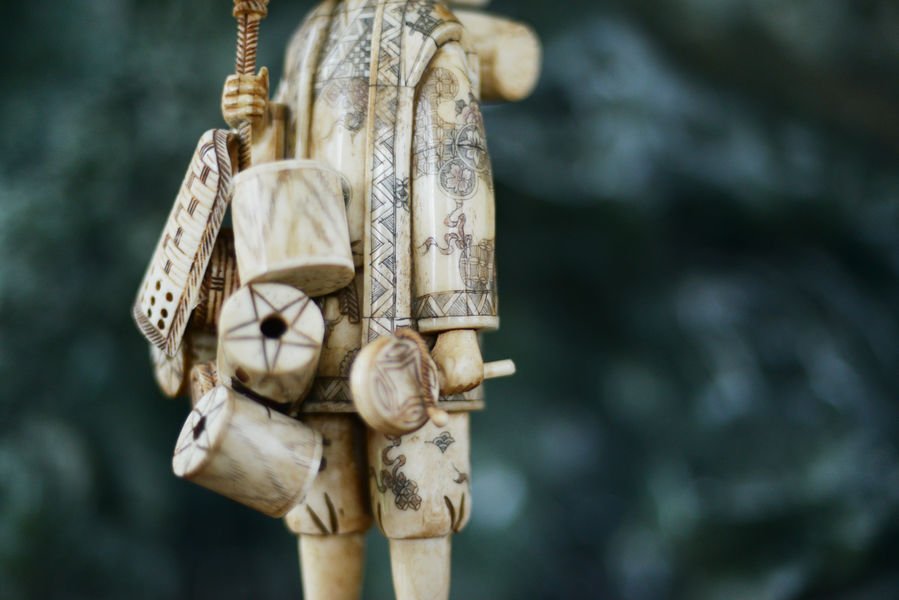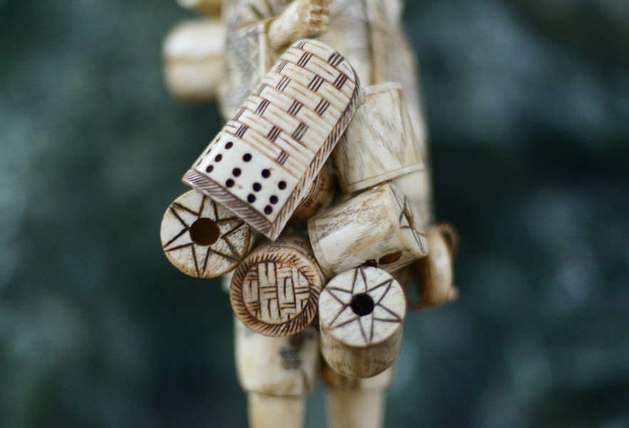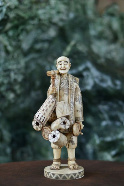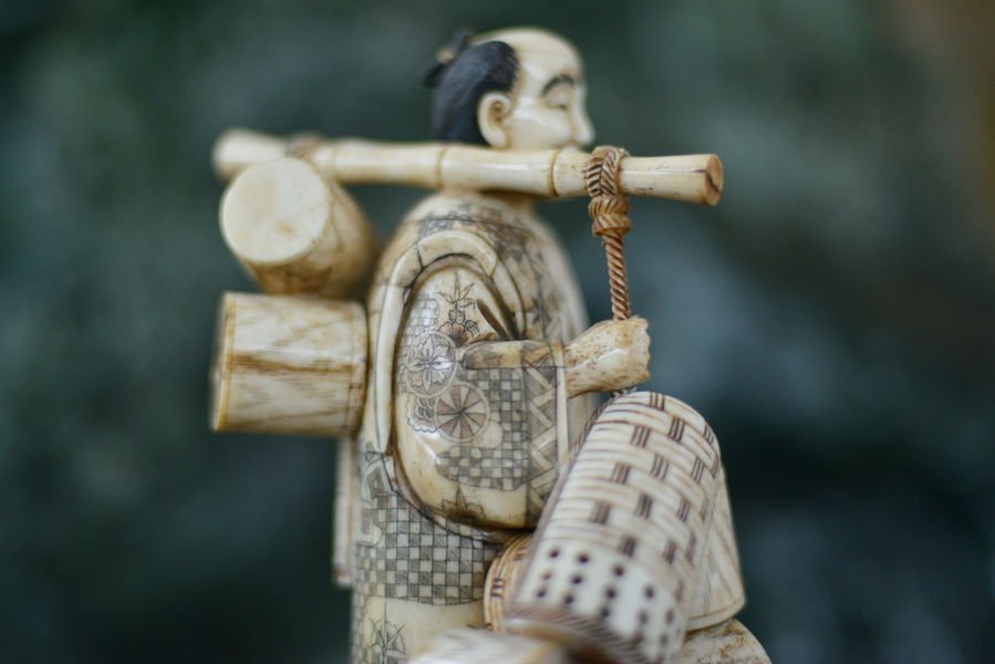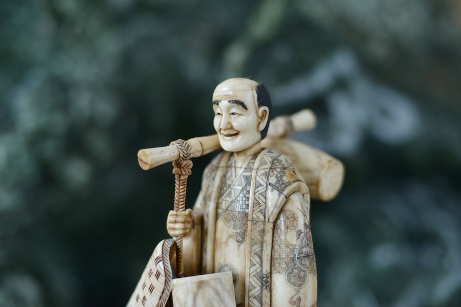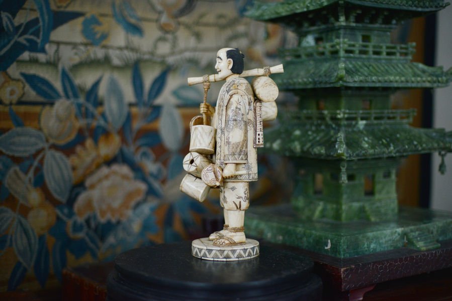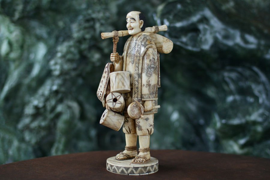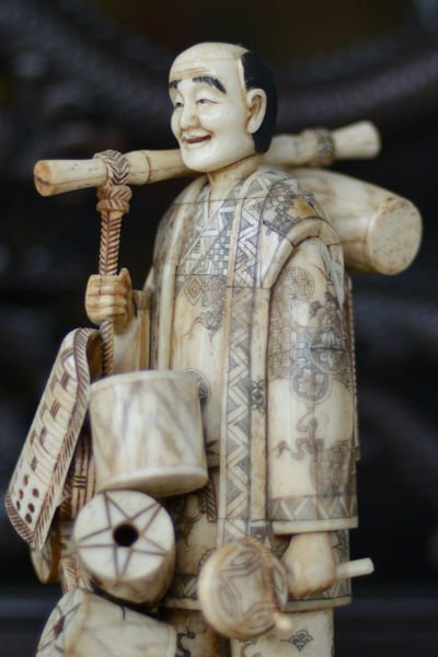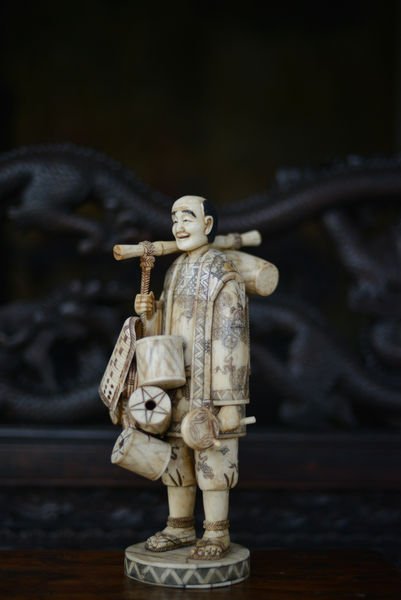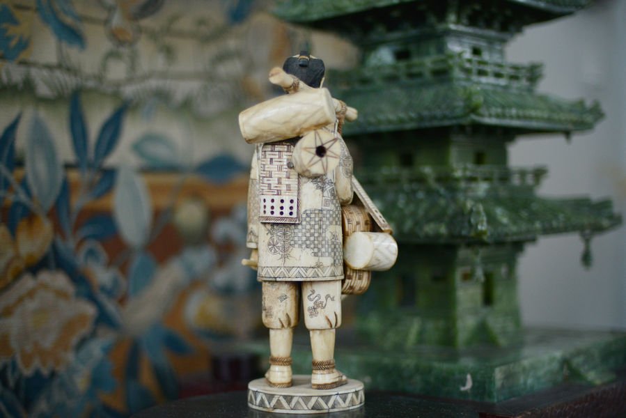A charming statuette depicting a smiling hawker laden with baskets and small everyday items. Finely carved and engraved, the figure carries a shoulder pole with various containers suspended from it, evoking the nomadic life of Japan’s street trades. The details are delicate: engraved patterns on the clothing, miniature accessories, and a gentle, cheerful expression. A lively decorative piece, ideal for a display case, an arts collection, or a cabinet of curiosities.