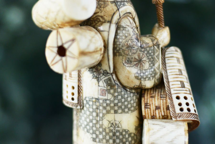 Statuette représentant un colporteur chargé de ses paniers et petits objets du quotidien. La figurine, finement sculptée et gravée, porte une perche sur l’épaule, avec différents récipients suspendus, évoquant la vie nomade des métiers de rue au Japon. Les détails sont délicats: motifs gravés sur le vêtement, accessoires miniatures, expression du visage souriant et pleine de douceur. Un bel objet décoratif, très vivant, idéal pour une vitrine, une collection d’arts ou un cabinet de curiosités.