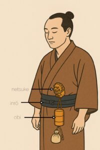 Although spontaneously associated with Japanese culture, netsuke have Chinese roots. Like the kimono, they were imported and then transformed in Japan, where they acquired their own identity. The term netsuke (付), composed of ne (root) and tsuke (to attach), refers to its primary function: fastening to the sash (obi) of the kimono — which lacked pockets — small everyday objects such as the inrō (seal case or medicine box) or various sagemono (hanging pouches). From a simple plant fragment serving as a clasp, the netsuke quickly evolved into a refined object.