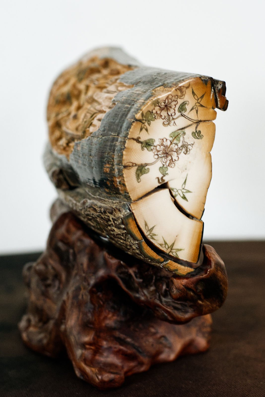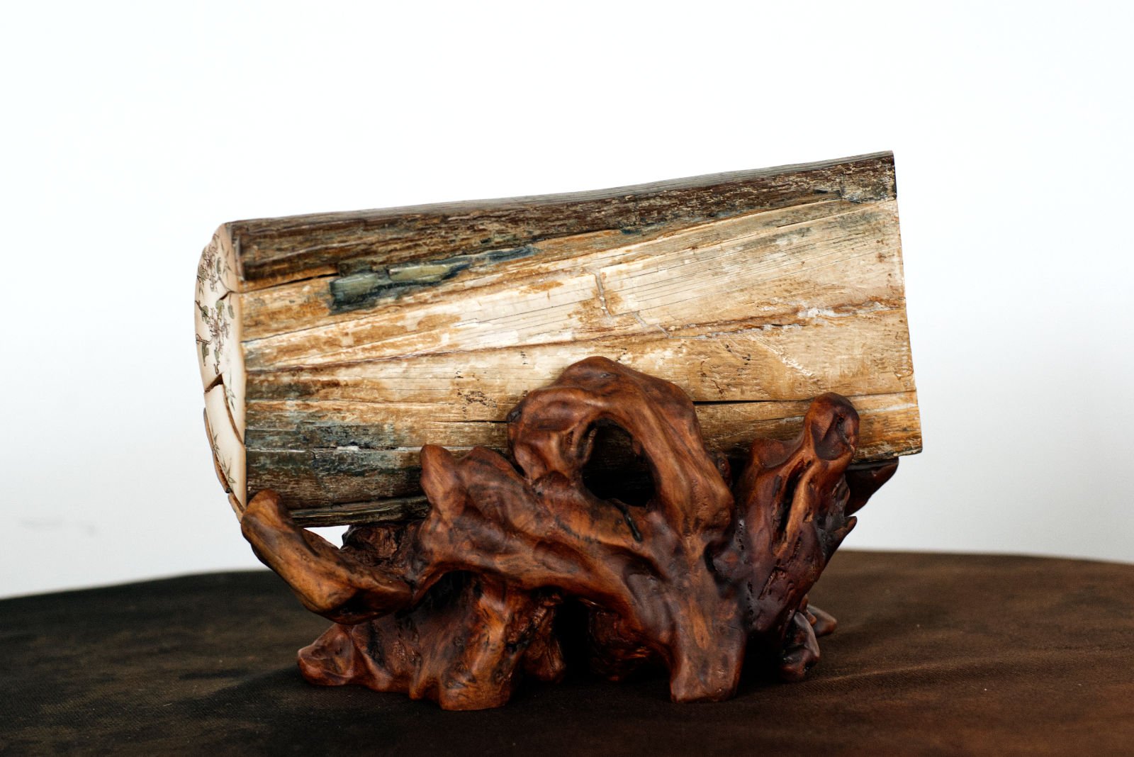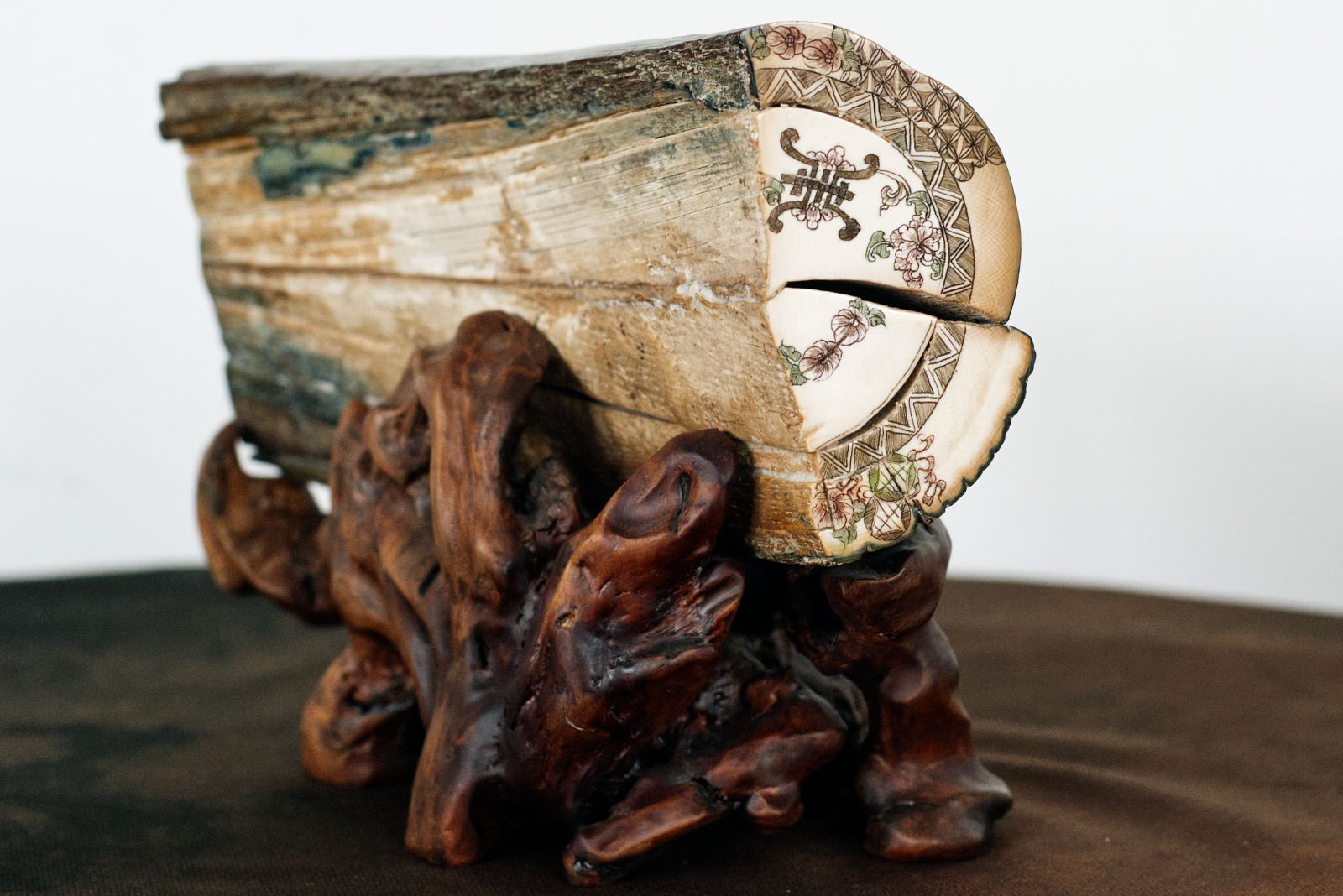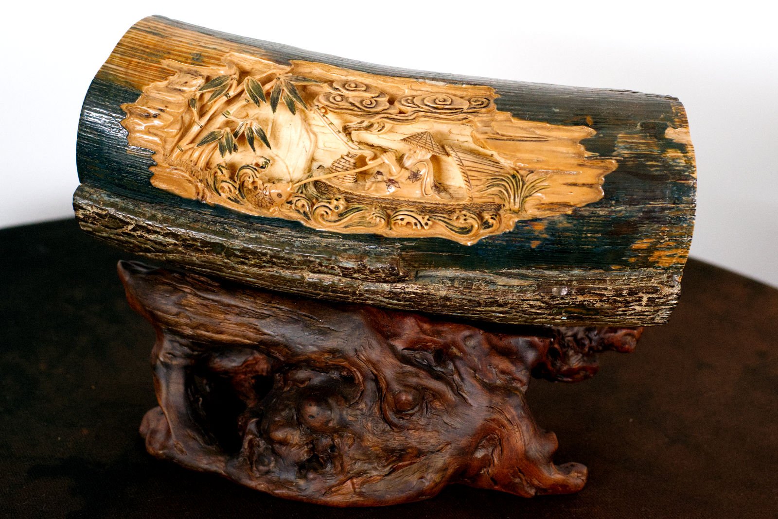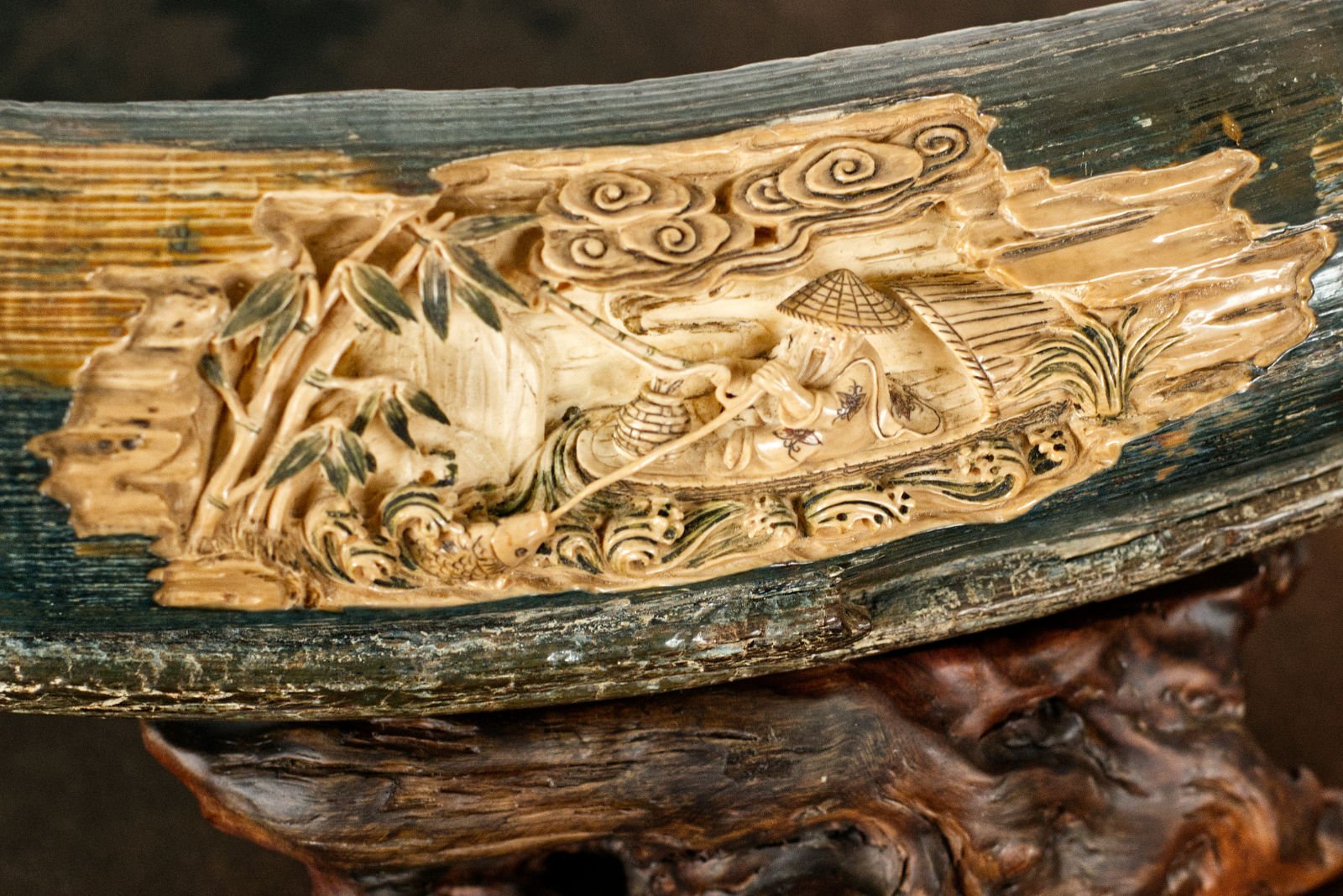 A bas-relief carved from fossilised mammoth ivory, set upon a wooden stand.