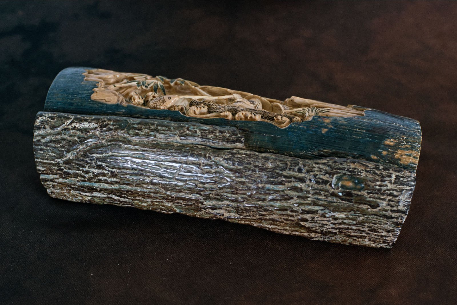 The gentle contrast betwixt the outer surface, veined with bluish hues of vivianite and lazurite, and the sculpted inner tones of brown, brings forth the delicacy of the engraving and the depth of the relief. The features of face and garment, the patterned forms, and the motion of the water bear witness to a labour of great refinement, imbued with the narrative spirit of a Taoist scholar.