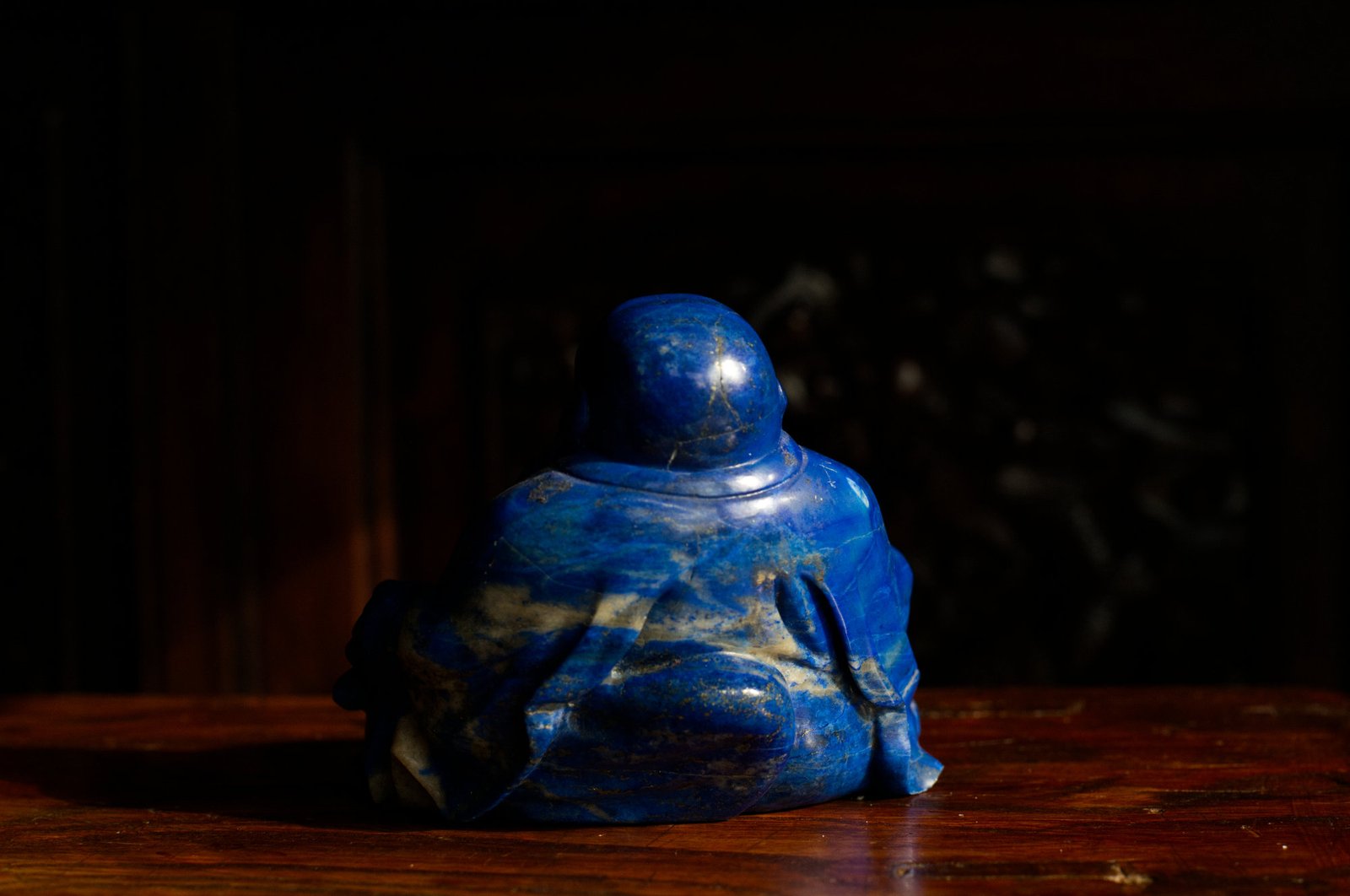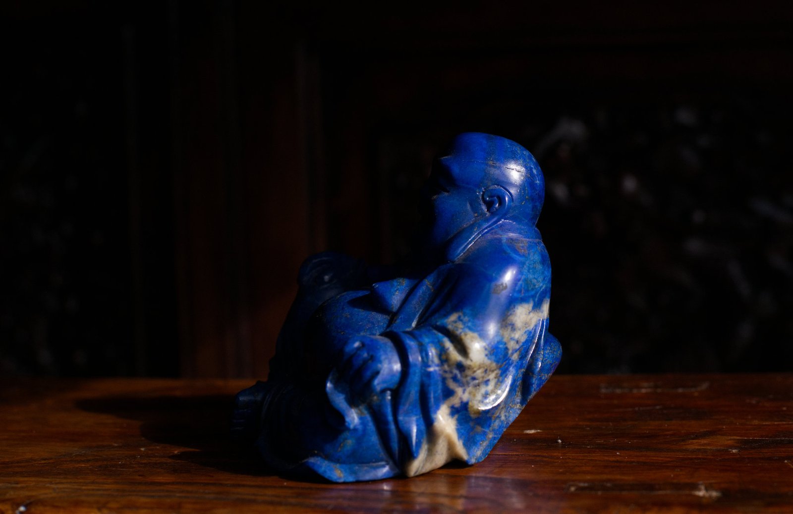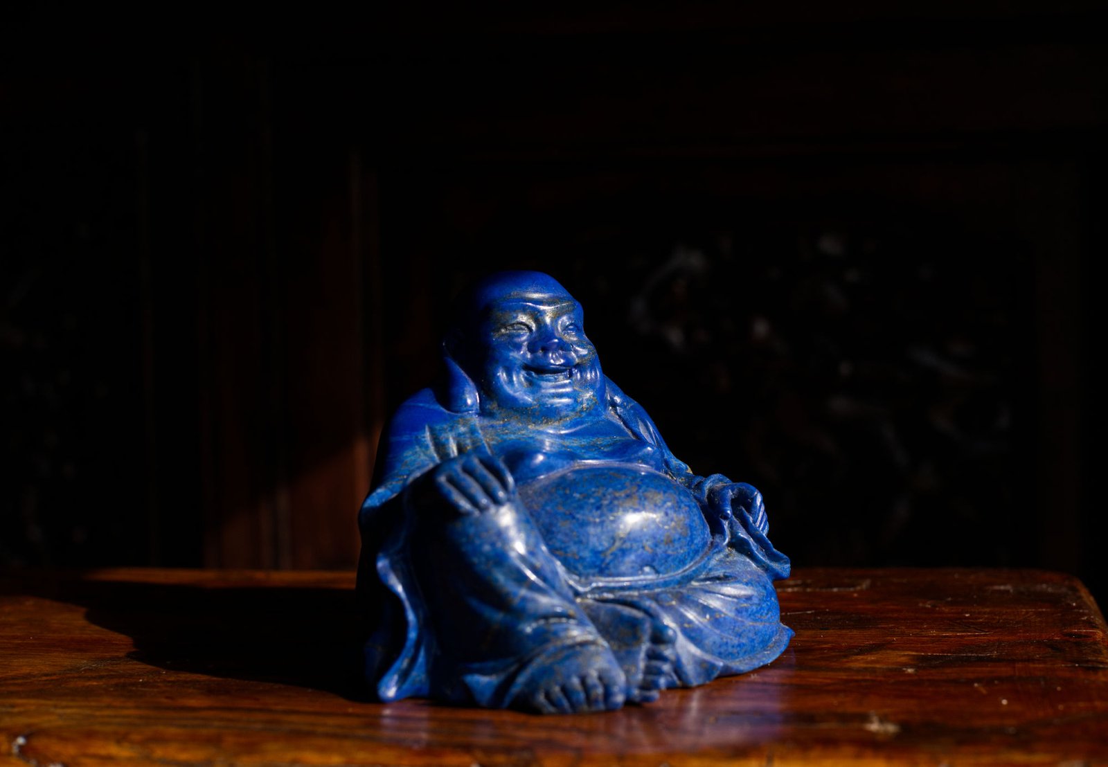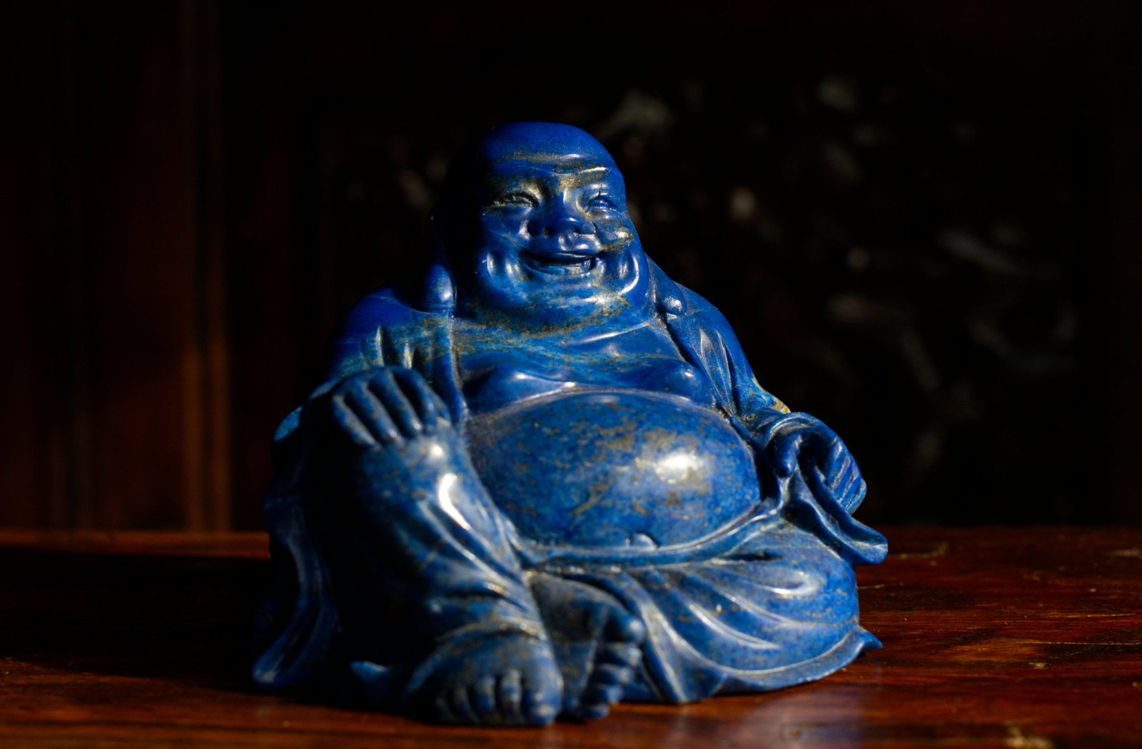 A figure of Budai with a serene and joyful expression, carved from a deep blue stone reminiscent of lapis lazuli.